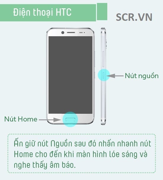 Cách 2: Đối với HTC có phím Home cảm ứng thì ấn giữ nút nguồn và giảm âm lượng trong khoảng 2 giây đến khi màn hình nháy lên và phát âm thanh thông báo.