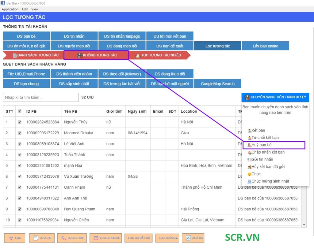 Sau khi quét xong bạn click vào mục Không tương tác. Lúc này bạn sẽ có được danh sách bạn bè không tương tác và hủy kết bạn với họ.